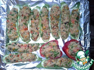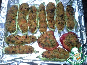 Начинить получившимся фаршем наши лодочки из кабачков. У меня остался фарш и я, почистив сладкий болгарский перец, решила его также начинить этой вкусной смесью..