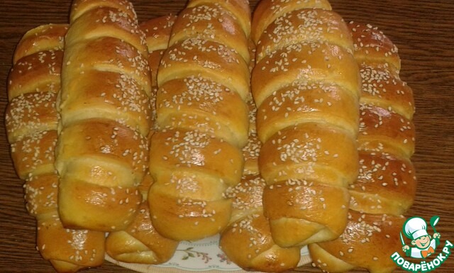 Поставить булочки на расстойку минут на 20. Затем смазать яичным желтком (с молоком) и посыпать кунжутом.