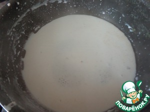 Тем временем готовим соус. В сотейники обжарим мелко нарезанный зубчик чеснока. Затем добавим сливки и немного соли, уварим до загустения.