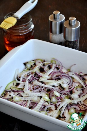 Слой тонко нарезанного лука и фенхеля.
