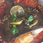 Рыба на самом деле может быть любой морской. Овощную "чешую" в оригинальном рецепте выбрасывали. Не вижу в этом смысла, мало того, что она очень вкусная, к тому же это готовый ароматный гарнир, который готовится по времени вместе с рыбой.