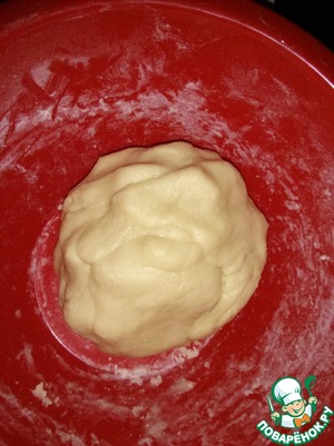 Приготовим тесто: на небольшой скорости взбиваем яйца и сахар. Затем добавляем талое (не растопленное, а просто мягкое) масло и смешиваем вилкой. Теперь соль, немного муки, гашеную соду и вымешиваем вилкой добавляя понемногу оставшуюся муку, до образования такого колобка. Ну, вобщем, как обычное песочное тесто.