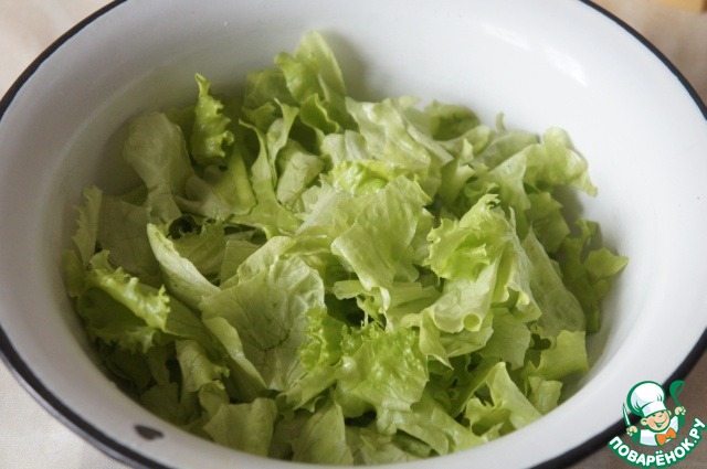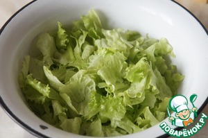 В широкую миску нарвать руками салат.