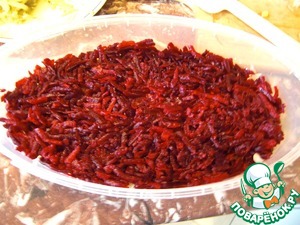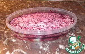 Половина соленых огурцов, половина свеклы, слой майонеза.