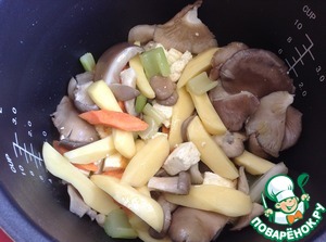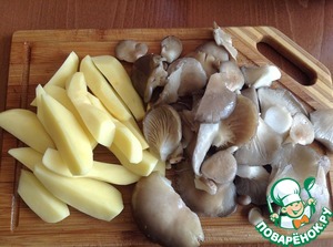 Добавляем нарезанные картофель и грибы, аккуратно перемешиваем, продолжаем жарить еще минуты 3.