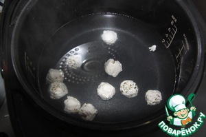 В мультиварку налейте воду и включить программу варить на 30 минут. Довести воду до кипения и бросьте в нее фрикадельки на 2 минуты. Выньте их шумовкой.