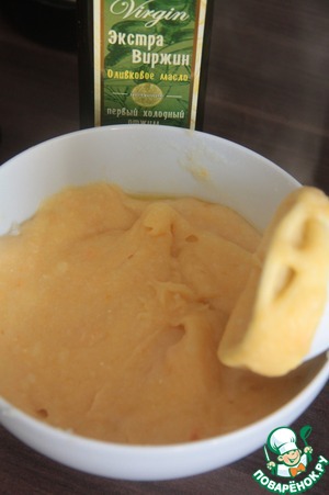 При помощи погружного блендера приготовить из овощей пюре, добавив 1 ложку оливкового масла.