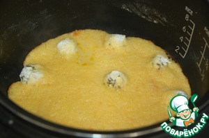 Вернуть в мультиварку фрикадельки, залить пюре и включить программу запекание на 10 минут.