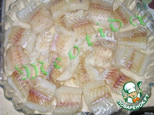 Рыбу порезать небольшими кусочками, положить в круглую форму для выпечки, посолить, поперчить.