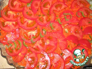 Помидоры очистить от кожуры, порезать тонкими полукругами, положить слой на морковь.