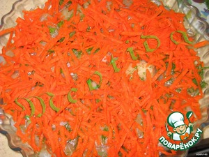 Рыбу посыпать измельченной зеленью, сверху слой морковки. -