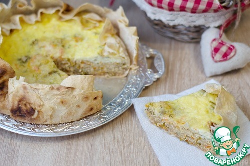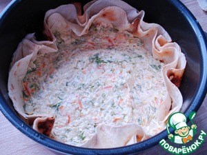 Чистую чашу мультиварки смажьте маслом, выложите лаваш. И начинку.