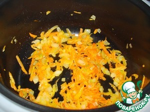 Лук и морковь очистите. На крупной терке натрите морковь. Лук нарежьте. В мультиварке в режиме “поджаривание” на растительном масле, обжарить лук и морковь, примерно минут 8.