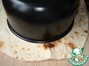 Из двух листов тонкого лаваша вырежьте круг, больше диаметра чаши мультварки примерно на 8 см.