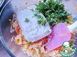 Потушенную капусту выньте из чаши мультварки, немного остудите, добавьте творог, порезанный укроп, соль, перец. Перемешайте.