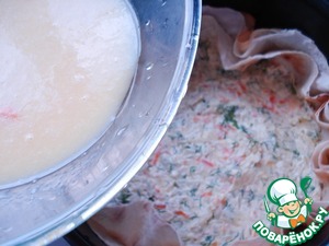 Сделайте заливку, яйца размешайте с 50 мл молока, солью, натертым на мелкой терке сыром. Залейте сверху пирог.