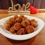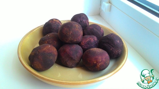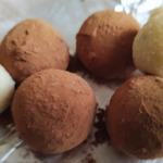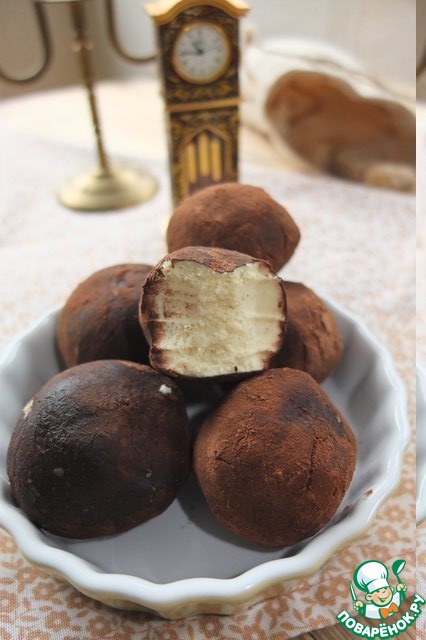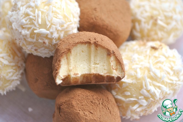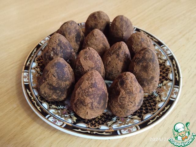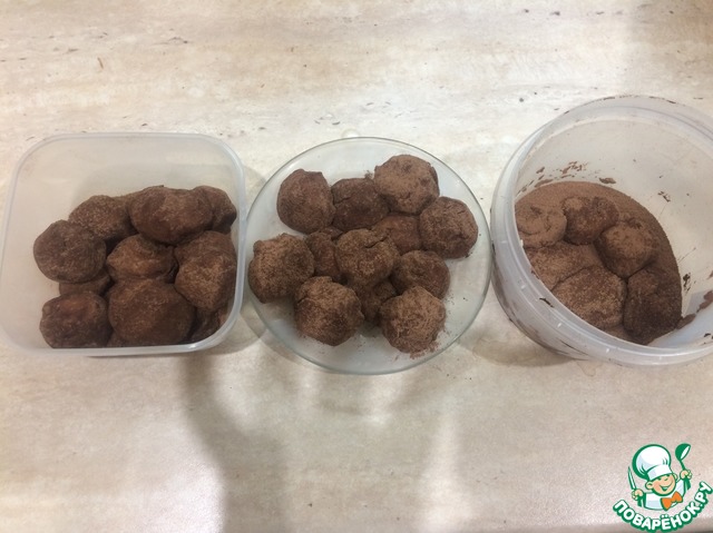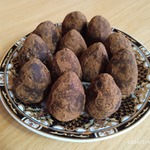 [+4]У меня получилась довольно плотная текстура, ближе к трюфельной) Кол-во сахарной пудры я уменьшила на 1/4, для обвалки использовала алкализованный какао - на вкус очень гармонично!