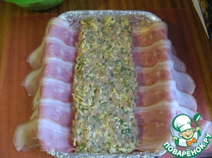 Выстилаем форму полосочками бекона так, чтобы свисали края. Для моей формы я использую 12 полосочек.