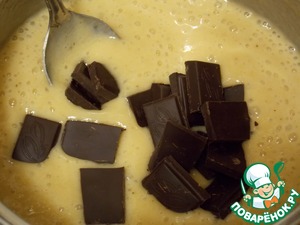 • Все хорошенько пюрировать, чтобы не было кусочков. Положить поломанный шоколад. Поставить на маленький огонь и варить, все время мешая, пока шоколад не растворится. Снять и остудить. Поставить в холодильник.