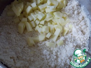 Яблоки следует очистить, мелко нарезать. Положить в мучную массу и перемешать.