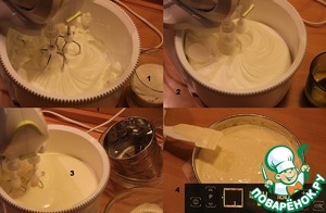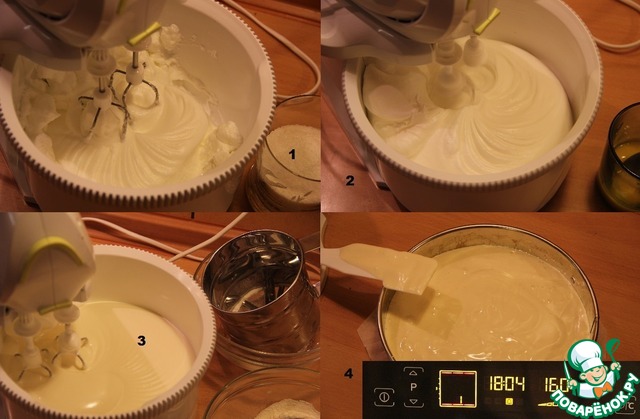 1. Отделяем белки от желтков. Белки взбиваем до твердых пиков, в конце постепенно вводим сахар.