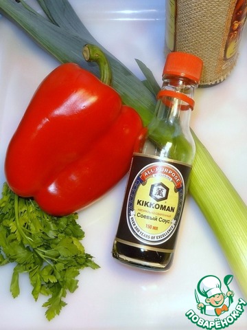 • Соевый соус, белое сухое вино, лимонный сок, лавровый лист, порезанную петрушку, немного соли и тушим 5 минут.