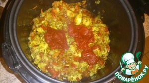 Как только мясо побелело, добавляем томатную пасту и пару минут обжариваем.