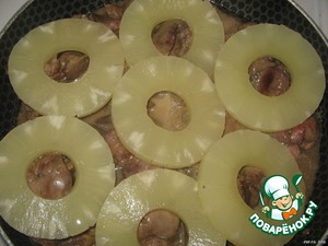 Печень промыть, посолить, поперчить. Залить сиропом от ананасов из банки.