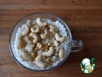 Сверху посыпаем любыми орехами, у меня кешью. Ставим в нагретую до 200 градусов духовку на 30 минут для запекания.