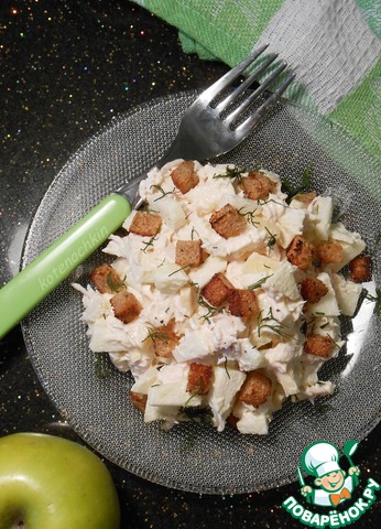 Соединяем куриное филе, сыр и яблоко, заправляем майонезом.