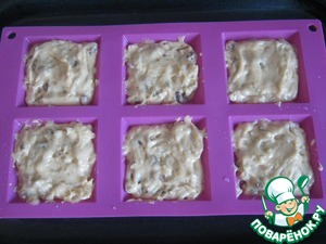 • Берём силиконовую форму в виде пирамидок и раскладываем в них тесто. Этого теста хватает ровно на 6 формочек.