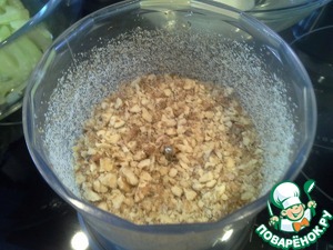 Грецкие орехи измельчаем в блендере, но не сильно, чтобы было понятно, что это орехи.