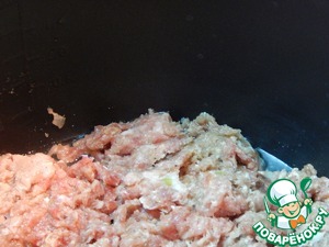 Включаем мультиварку в режим Поджаривание на 10 минут. Добавляем масло и фарш (у меня смешанный:говядина+с винина). Обжариваем минут 5.