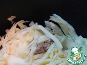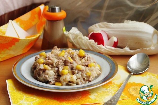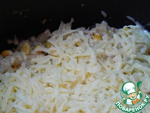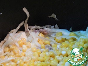 Включаем мультиварку в режим Тушение на 60 минут. В молоке предварительно разводим муку. Добавляем к мясу и капусте кукурузу и молоко.