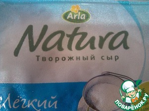 Пока печется бисквит, нужно приготовить крем: распустить желатин, смешав его с 1/3 стакана воды и оставить на 40 минут, чтобы гранулы набухли. Затем поставить на маленький огонь и, постоянно помешивая, нагревать, но не кипятить, чтобы гранулы растворились. Взбить творожный крем-сыр - я использовала вот такой...