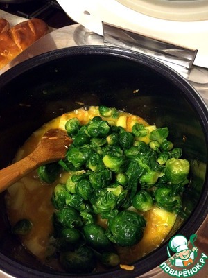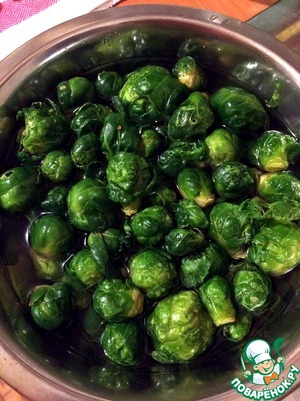 Брюссельскую капусту я предварительно замочила в кипятке с лимонным соком, чтобы удалить из нее горечь. Черешки обрезать. Конечно, о брюссельской капусте в советские школьные годы мы и не слышали, пользовались обычной белокочанной.