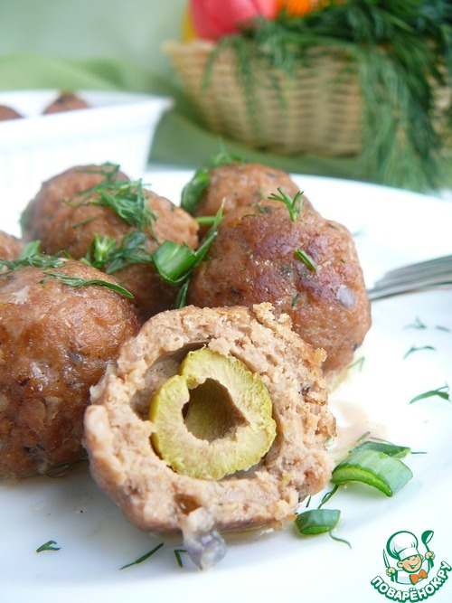 Предлагаю приготовить аппетитные мясные шарики с оливками. У меня к оливкам особая слабость. Не могу себе отказать. Если у вас есть слабости в виде соленых огурчиков, твердого сыра, болгарского перца, замечательно, они тоже подойдут в качестве начинки!