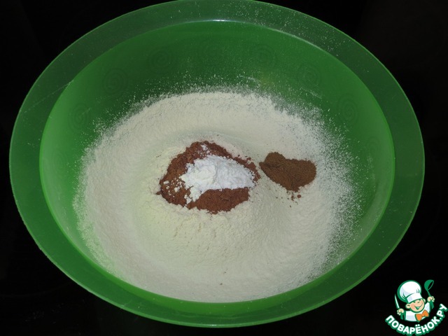 Отдельно в замесочном блюде перемешиваем полтора стакана просеянной через сито муки с двумя столовыми ложками какао, одной чайной ложкой разрыхлителя, чайной ложкой корицы.