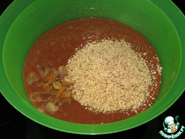 При помощи венчика (или миксера) взбиваем сахарную и мучную смеси. В процессе перемешивания добавляем в тесто полстакана изюма (кураги, инжира или всего сразу), а также измельченные орехи.