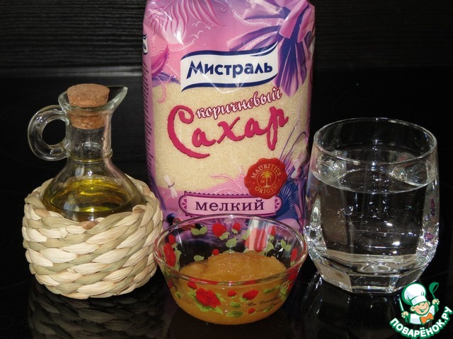 Берем 200 гр сахара, 250 мл воды (или сока), 2 ст. л. меда и полстакана растительного масла. Перемешиваем и подогреваем до 60°C.