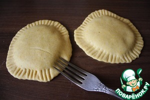 Вокруг начинки вырезать стаканом лепешки. По краю для надежности можно пройтись плоской стороной вилки.