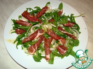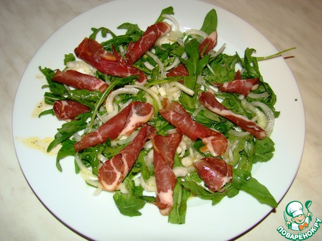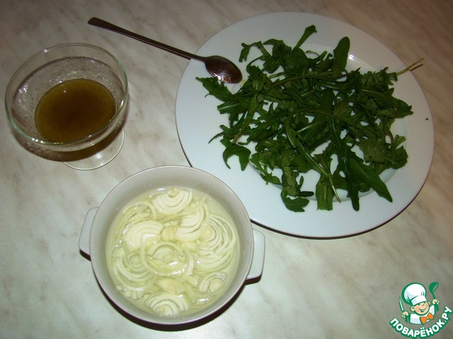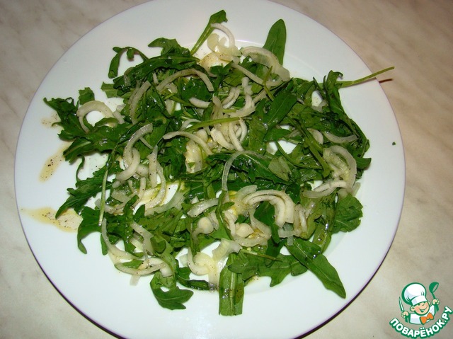 Сливаем воду с лука, промываем холодной водой и раскладываем поверх рукколы. Сбрызгиваем все это нашей заправкой.