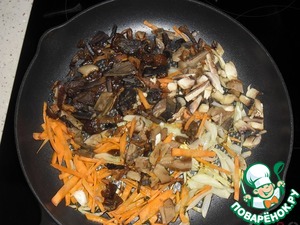 Часть шампиньонов порезать мелко, часть- красивыми пластинками. На сковородку налить масло, слегка обжарить лук, морковь, мелко порезанный чеснок. В овощи добавить все грибы. Всё потушить на среднем огне минут 10.