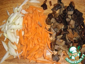Лук, морковь нарезать соломкой. Грибы нарезать на ломтики.