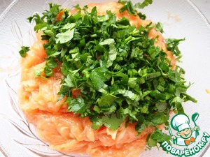 Зелень помыть, мелко порезать и добавить к курино-овощной смеси. Перемешать.
