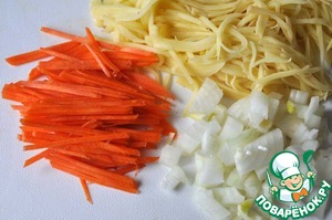 Овощи моем, чистим. На мелкой тёрке натираем морковь, картофель. Лук режем мелкими кубиками.