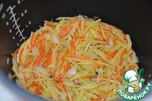 Включаем мультиварку на режим "Поджаривание", в чашу наливаем растительное масло.