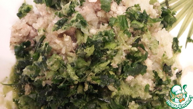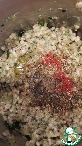 В готовую охлажденную перловку добавляем мелко порубленные грибы, лук, 3елень (набор 3елени можно менять по собственному вкусу).
