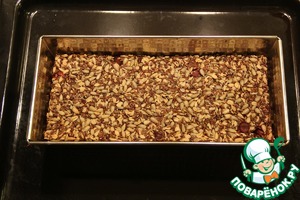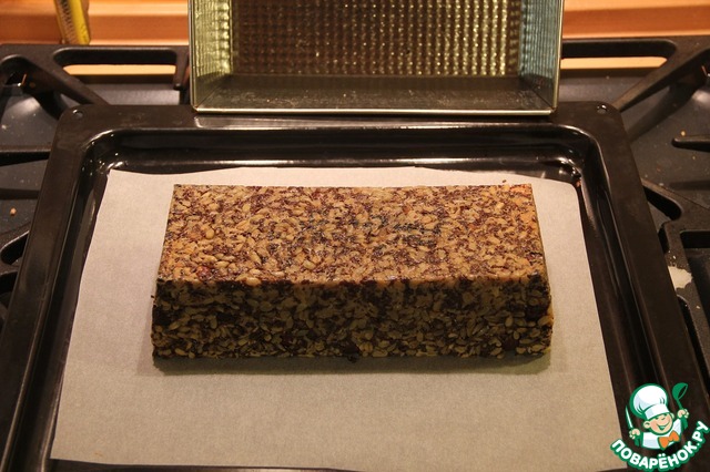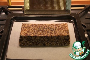 После этого переворачиваем форму на противень, застеленный бумагой для выпечки (хлебушек прекрасно выходит), и помещаем обратно в духовку на 40-50 минут - до золотистой корочки.