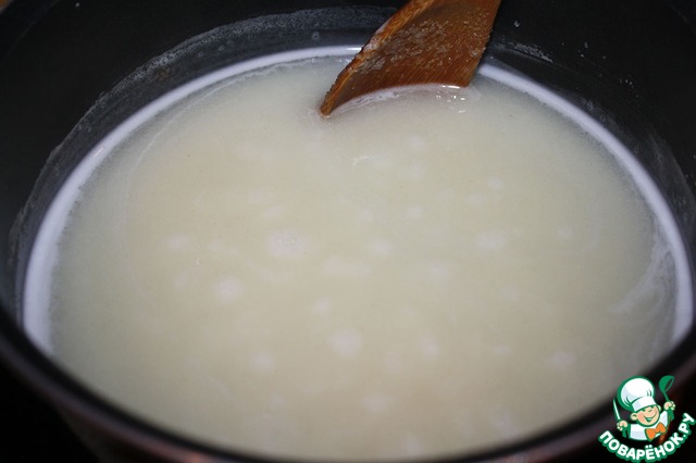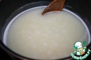 • Из 500 мл воды, 5 ст. л. сахара ТМ Мистраль и 4 ст. л. манки варим кашу примерно 20 мин, периодически помешивая. Остудить